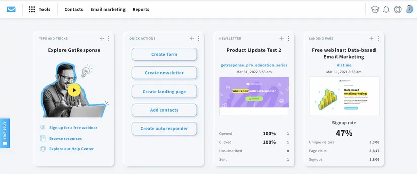 GetResponse stawia na to, byś mógł(a) zarządzać dużą częścią działań marketingowych z jednego panelu, bez konieczności żonglowania kilkoma odrębnymi usługami.